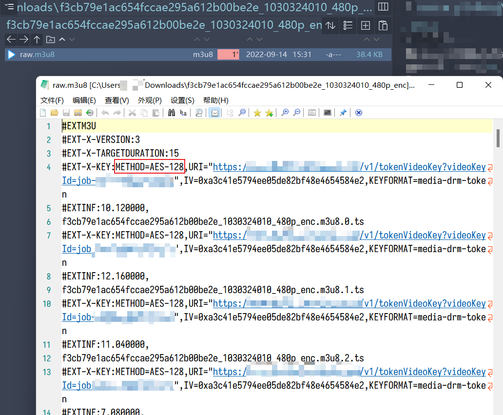 文件中的METHOD=AES-128、IV=***、KEYFORMAT=media-drm-token确定视频使用了 AES-128-CBC 加密
