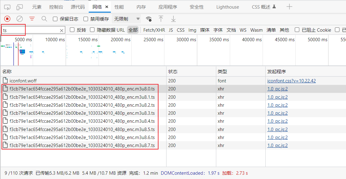 在浏览器使用F12打开开发者工具,切换到“网络”选项卡,刷新页面并加载一小段,搜索ts: