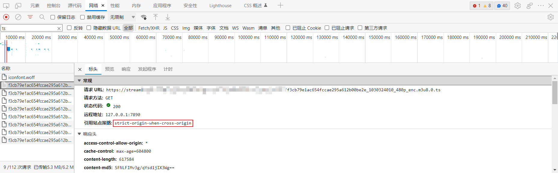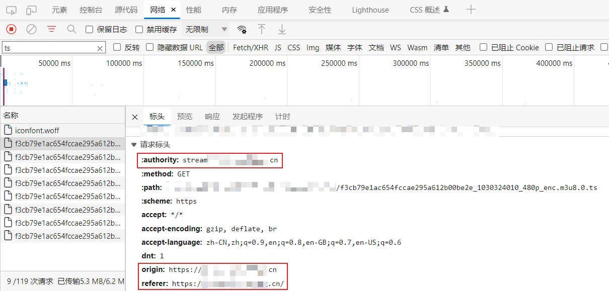 从以上截图中还可以发现该视频网站的引用站点策略(Referrer Policy)设置为strict-origin-when-cross-origin用于防盗链,查看多个ts文件的请求Headers,在构造请求时添加额外值: