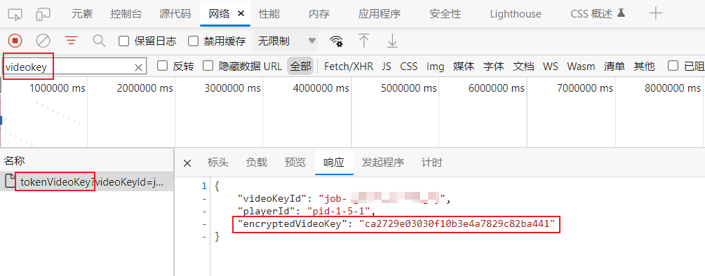 根据以往的经验,加密M3U8文件一般在头部会注明获取key的URL,但从截图中发现此M3U8文件并未标注,因此在浏览器开发者工具中搜索videokey,果然发现一条记录: