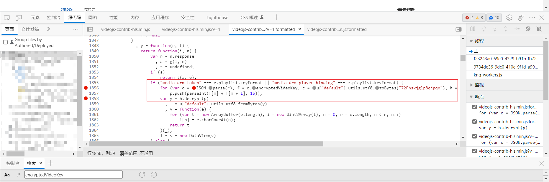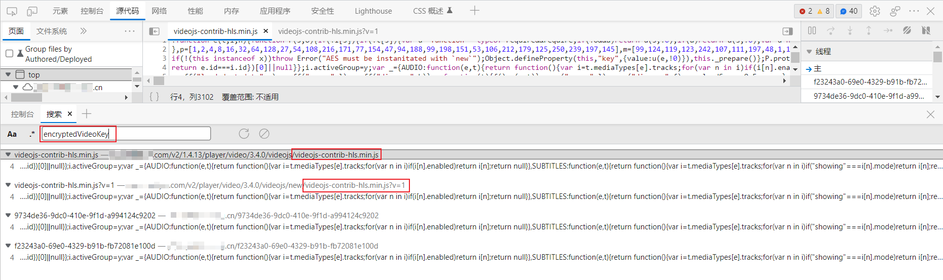 在开发者工具-源代码标签页内右键顶级目录,选择“在所有文件中搜索”,查找encryptedVideoKey字样,得到以下结果: